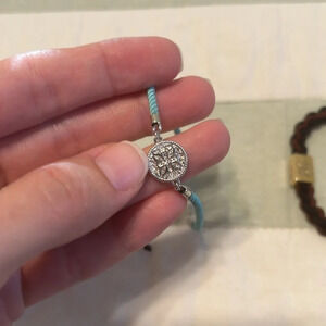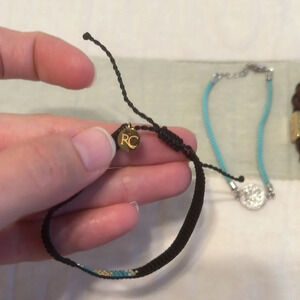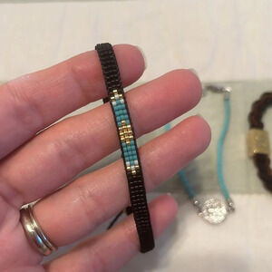 Selling these three rustic cuff bracelets as a set. They are very pretty together. A little bit more on the daintier side. One has black, turquoise, and gold tiny beads. one has a blue rope style with silver lobster clasp. and the other is a braided, black and brown stretch style with a gold rustic cuff logo on it.