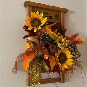 Enhance your home with this charming rustic wall accent featuring vibrant sunflowers and autumn leaves. Perfect for adding a touch of nature to any room. Approximately 18x 11.