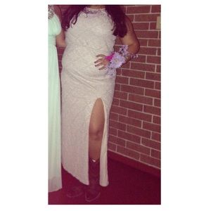 This is my prom dress that I wore only once! I got it professionally tailored to have a slit in the front, so that my boots could show. I absolutely loved it! I'm 5'5" so it wasn't too high. Only selling the dress as of now.