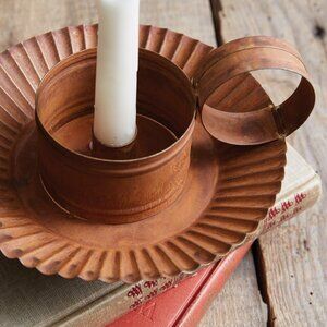 Here is a new rustic Chamberstick candle holder, This welcomes primitive and rustic aspects to a home. Crafted with meticulous attention to detail, this piece is more than just a candle holder; it's a conversation starter, a replicated piece of history, and a symbol of enduring beauty. This lantern is crafted from metal and features a hurricane glass Measurement 7.5 ''W x 7''D x 9.25 ''H , This will hold a standard size or smaller taper candlestick or battery candlestick, AND CANDLE IS NOT INCLUDED, THIS IS FOR HOLDER ONLY, nice rustic candle holder,