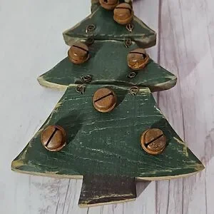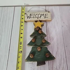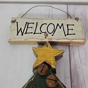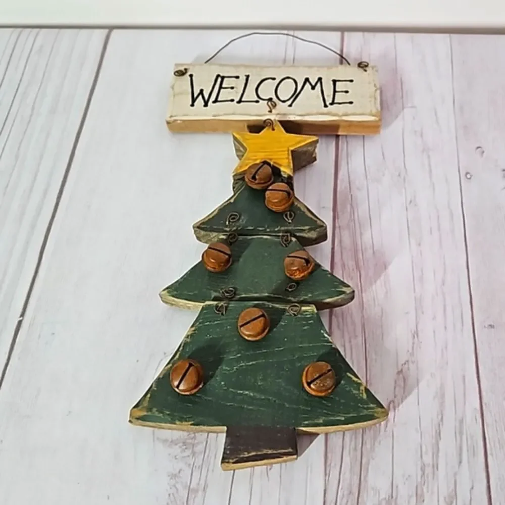 Great pre-owned condition small welcome Christmas tree hanging sign made of wood with rusty bells.