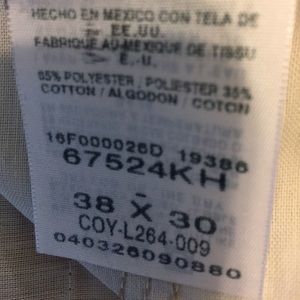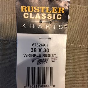 These are a great brand new pair of Rustler Classic Khakis. The pants are brand new with original tags, never used. The pants are a men's size 38 x 30. They are khaki in Color, wrinkle resistant, made of cotton and polyester, has two front pockets and two back pockets, and ship immediately to US addresses!