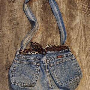 This cute jean purse has functioning pockets. Animal print scarf added for the belt with lots of bling. Strap measures 19 inches from top of purse to top of strap. Purse opening is approx. 11 inches. Front of purse is approx. 14 inches across and 9 inches tall. Purse is not lined