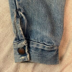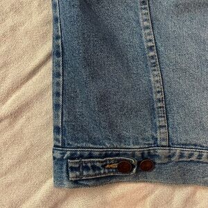 Light Denim Button Jacket. Double breasted pockets w snap buttons. Adjustable waist and snap button cuffs.