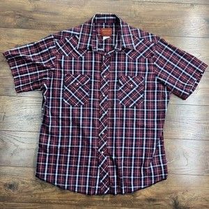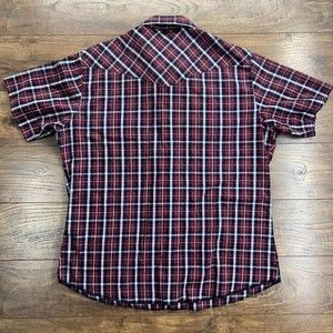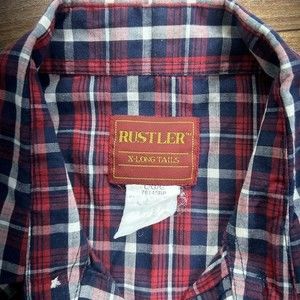 Rustler Shirt Large Red Blue Plaid Western Pearl Snap X-Long Tails Pockets
