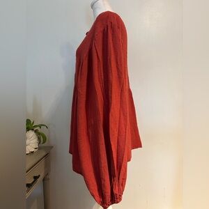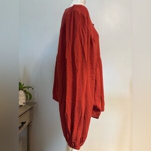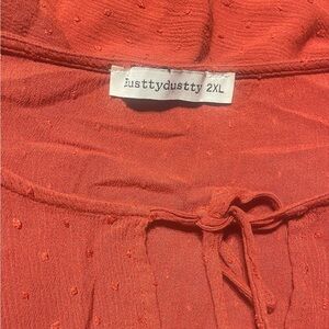 Stay effortlessly stylish with this Rustty Dustty women’s boho peasant blouse in size 2XL. Featuring a rich rust orange color, lightweight textured fabric with subtle dotted detail, and voluminous balloon sleeves for a flattering flowy fit. The front tie neckline adds a feminine, vintage-inspired touch. Perfect for layering year-round with jeans or leggings.