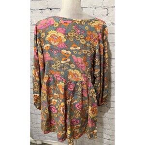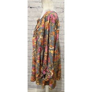The RusttyDustty Boho Floral Long Sleeve Button Front Shorts Romper in size 0XL is a stylish and versatile one-piece outfit perfect for women. Made of viscose fabric with a rayon texture, this romper features a beautiful floral pattern in multicolor, short sleeves, and a convenient button front design. The romper includes shorts and is suitable for multiple seasons including summer, fall, and spring. Ideal for casual wear, this romper from the brand Rustty Dustty is a fashionable choice for women looking for a trendy and comfortable outfit. 30 inches pit to pit, 46 inch waist, 15 inch inseam and 33 inches long. Smoke free home.