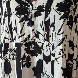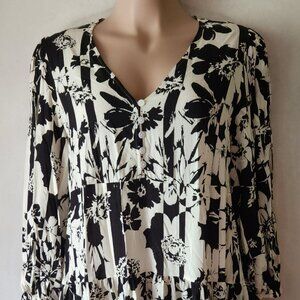 Reposhing this item I purchased from @leenysuitsyou2. Loved it, but didn't fit. Size 2X. A fun floral print in black & off white. Long sleeves with elastic at the wrist. Tiered skirt, v-neck with button detail. Approx. 23" across chest, & 37" length.