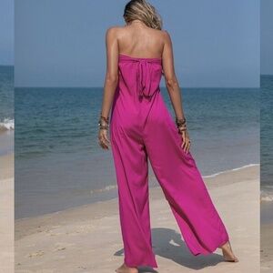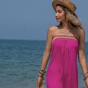 Rusttydustty Hot Pink Geometric Embroidered Tube Top Wide Leg Jumpsuit Medium, New with Tags!