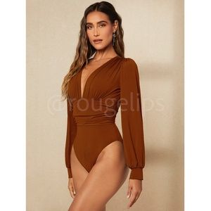 Rusty Brown Elegant V neck Bodysuit Long Bishop Sleeves Stretchy Ruched Waist