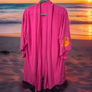Rusty Dusty XL Swim Cover Up Pink Embroider Open Front Wrap Side Slit Boho Beach