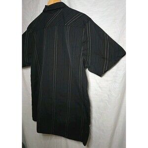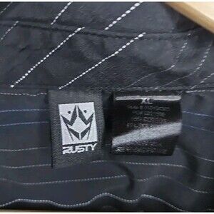 The Rusty Short Sleeve Button Shirt in size XL is a stylish and versatile addition to any man's wardrobe. Made from a blend of polyester and cotton, this black shirt features a striped pattern, collared neckline, and button closure. Perfect for a preppy look, this button-up shirt is ideal for all seasons and can be worn with ease. The shirt also includes accents like a logo and is designed with a regular fit, making it comfortable for everyday wear. Ideal for summer, fall, and spring, this shirt adds a touch of 90s flair to any outfit.