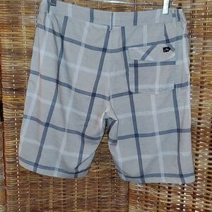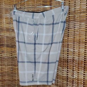 This is a pair of Rusty Utility Series land or water shorts. They have a zippered fly, 2 hand slit pockets, and a Velcro back pocket.