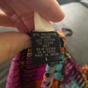 Super colorful Rusty tank top with adjustable straps. Really cute button detail on the black fabric. Fun and Funky. Approximately 18 inches pit to pit. Body of fabric does not have any give, there is some stretch in the black portion of the top. Size Large but runs more like a Medium.
