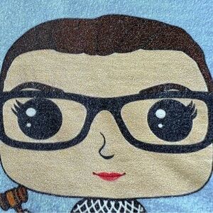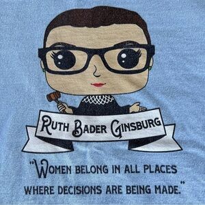 Ruth Bader Ginsberg RBG Short Sleeve Crewneck T-Shirt. Youth size 4/5. Light Blue with a large cartoon graphic and the quote, “Women belong in all places where decisions are being made.” Good preowned condition with light wash wear/fade from normal use. Size/material tag removed.