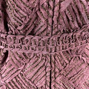 Satin ribbons are intricately sewn into mesh to create this elegant 70’s Midi dress. Features keyhole neckline, long sleeves, a-line skirt, zipped back and matching soutache belt.