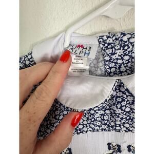 Ruth and Ralph smocked bubble, blue and white floral fabric with smocked blue and white Staffordshire dog statues, peter pan collar - my daughter outgrew it before we could wear!