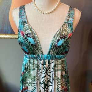 Beautifully silk print in gorgeous colors of turquoise blues and pink. Amazing floral and tropical bird details. Dress has adjustable straps. Silk/spandex blend. Empire elastic waist. Size medium.