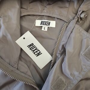 This is a Ruxen windbreaker jacket for men in size L, made of polyester with a softshell fabric type. It features a quarter zip closure, brown color, and embroidered logo. The jacket is lightweight and suitable for outdoor activities like walking, golf, and hiking. It has pockets and a solid pattern, perfect for travel or casual wear.