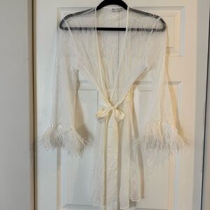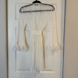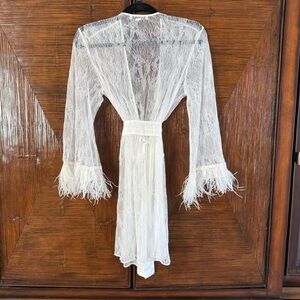 Rya Collection Women’s White Lace Feathered Trim Robe Attached Satin Belt S NWOT
