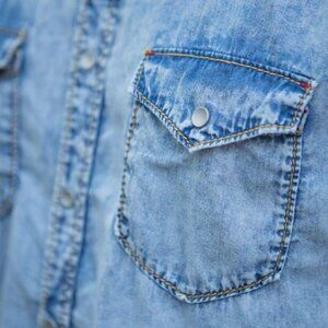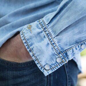 This is a great Ryan Michael Men's shirt in chambray color. Decorative gold thread, bowl silver snaps. Worn a couple times. Perfect shape no rips tears fading or holes. Non smoking. 65/15/10/10 cotton tencil silk linen. This is a great heavy shirt for winter. Perfect shape