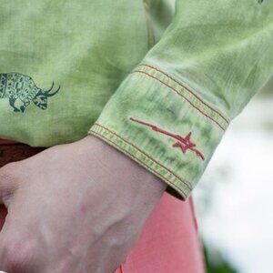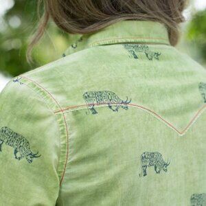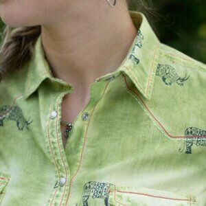 Ryan Michael Yac shirt in Lime,. Tab sleeves, Red detail stitching, Aztec silver snaps. Non smoking home.