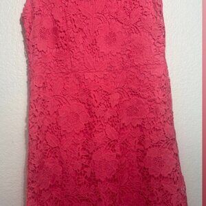 Pretty coral open-work lace sleeveless sheath dress, fully lined with exposed back zipper. Ryan Michelle, size ex lg). 40”bust, 33” waist, 42” hip, 40” long. Great condition, no damage or stains, clean. Perfect for any occasion. This dress always gets compliments! Unique color.