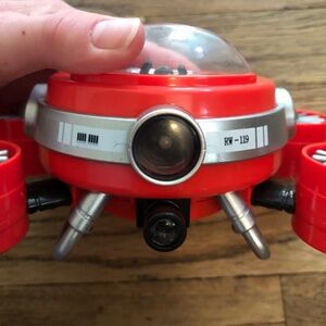 Ryans world set of toys with a ship that lights up the ship worked when we used it last but my child grew out of it and I believe the batteries have died, The Ryan characters can stand inside of it there is three Ryan characters kill the shark the Combo and the penguin peck.