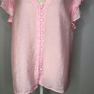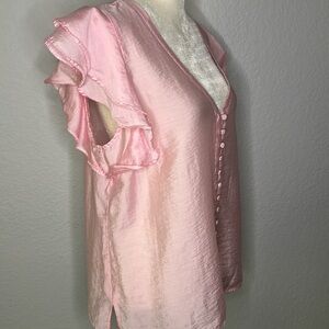 Elegant pink ruffle sleeve button-down top. Perfect for any occasion, this top adds a touch of femininity to your wardrobe.