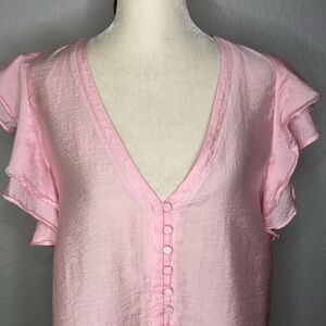 Rye Grass Pink Ruffle Sleeve Button-Down Tencel Top Large