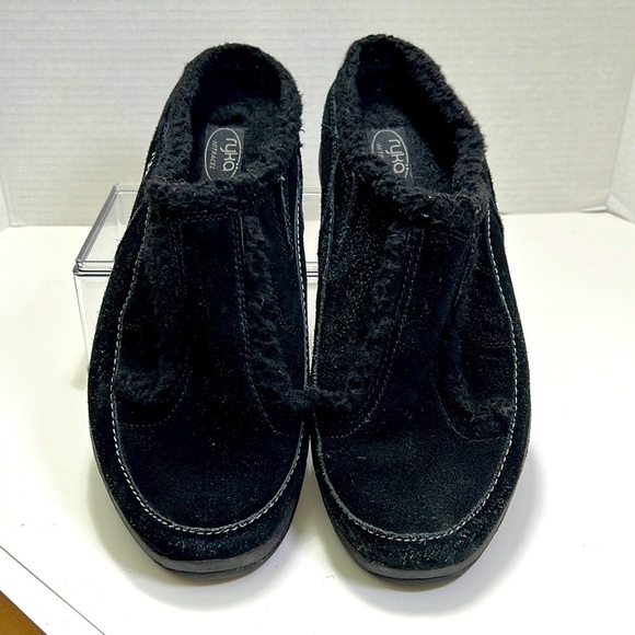 Chic black mules with cozy fleece lining. Ideal for everyday comfort.