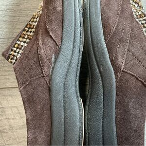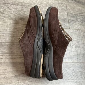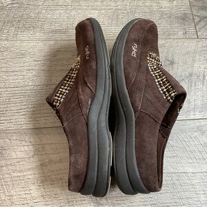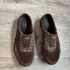 Ryka Freelance Brown Suede Slip On Mules. Womens Size 8. Tweed pattern on top. Gently used condition. Normal wear. Please see all photos for any flaws or conditions.