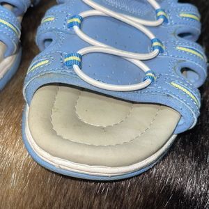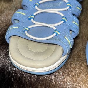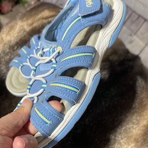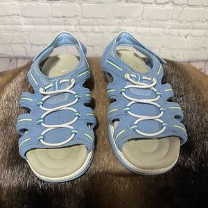 These are pre-loved and do show signs up wear but have a lot of life left. 8W is size and straps are adjustable. Blue with with and yellow trim.