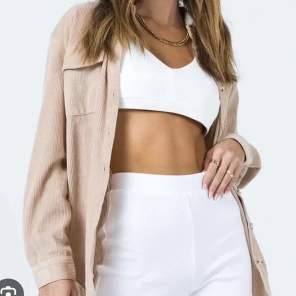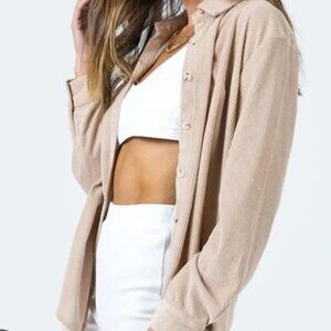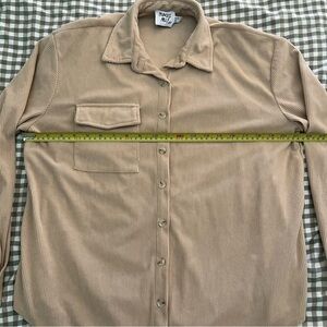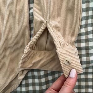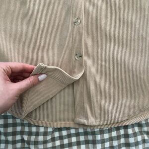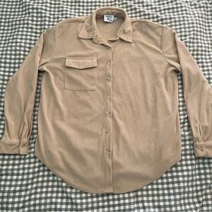 Soft corduroy shirt jacket. Button-front with single chest pocket. Classic collar and long sleeves. Neutral tan color for easy layering.