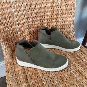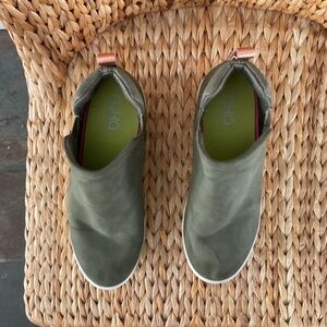 Very cute army green suede slip-on sneakers with copper stripe accent at back. Back half is a subtle snakeskin pattern. Gently worn, good condition.