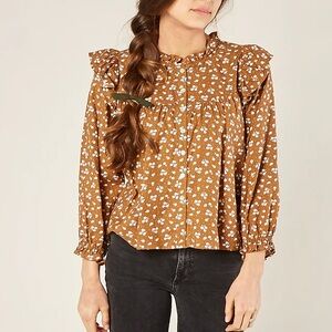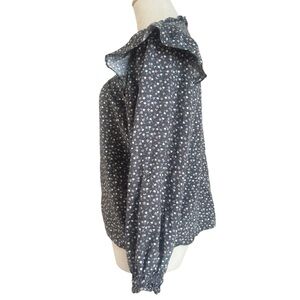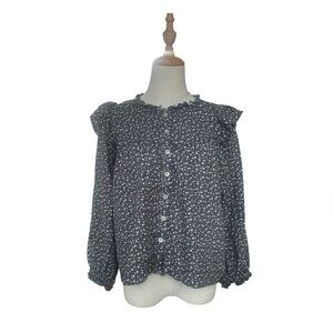 Cutie blouse for fall. This was their vintage style blouse. Has ruffle details on shoulders and neck, cropped sleeves, elastic sleeve cuffs with ruffle detail again. Color is a grey with blue undertones with a dainty (ditsy) floral print in creams and tan. Good preloved condition no flaws to note
