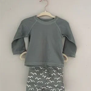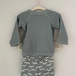 6-12 months Charming swim pajama set by Rylee + Cru. Features a blue top and matching bottoms with white wave patterns. Ideal for both sleep and swim.