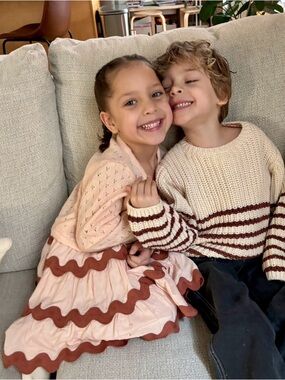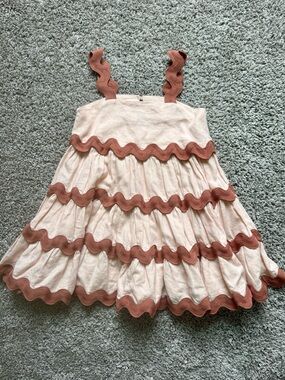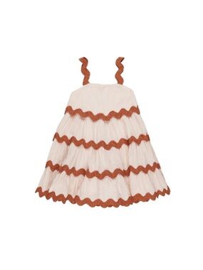 Cute sleeveless white dress with rust-colored wavy trim. Lightweight tiered design for comfortable play and easy movement. The twirl with this dress is elite. Perfect for warm-weather outings, cooler weather with a sweater, and special occasions.