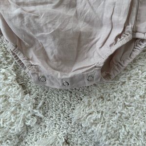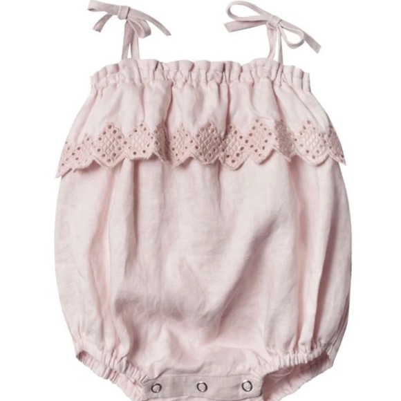 This sweet lilac eyelet ruffle romper is a must for your little girl. Easy to wear on the go with adjustable straps, a snap closure, and elastic leg openings. Machine Wash Cold. Line Dry or Dry Flat. 100% linen.