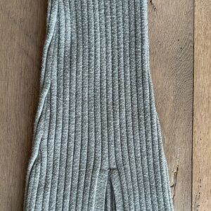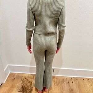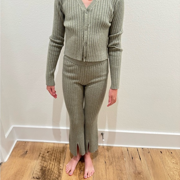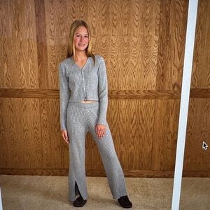 Chic ribbed knit set with cardigan and ankle pants. Ideal for casual wear.