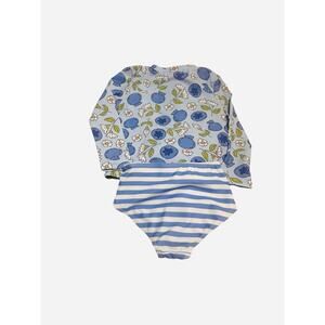 Keep your little one stylish and protected in this Rylee Faith Designs boutique rash guard swim set. This 2-piece swimsuit includes a long-sleeve blueberry & floral print rash guard top with a front zipper detail and matching blue-and-white striped bottoms. Perfect for pool days, the beach, or water play — and made with comfort in mind.