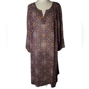 Ryllace Floral Silk Tunic Dress Split V Neck 3/4 Sleeve Red Tan Size 16