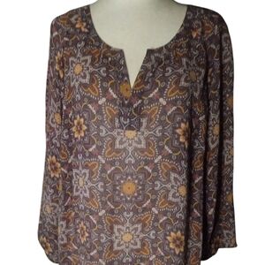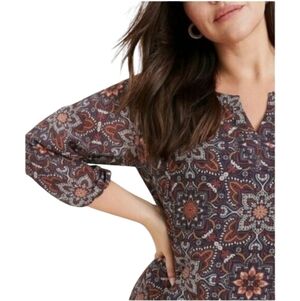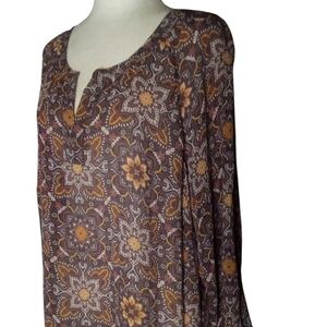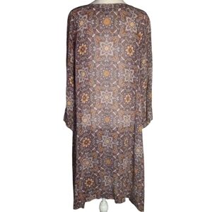 Ryllace Floral Silk Tunic Dress Split V Neck 3/4 Sleeve Red Tan Size 16