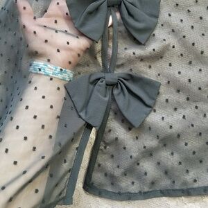 This top is an excellent condition. It has a textured front with a bit of shimmer to it . the back has a sheer pokadot material with four bows going down the back .H4