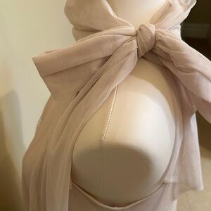 Elegant beige mini dress with halter neck. Features flowing fabric and unique hem accents. Perfect for chic occasions.
