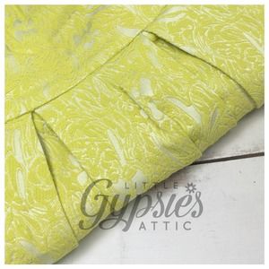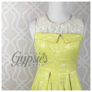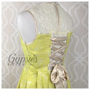 Dressy Retro Style in Yellow Lime Jacquard Fabric w/Complimenting Antique Ivory Lace & a Taupe Cream Ribbon Lattice Sash. Hidden Side Zipper, Pleated, Lined.