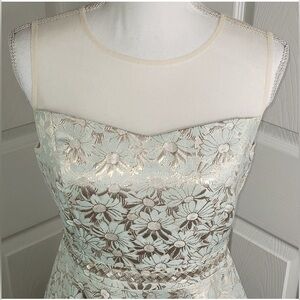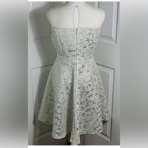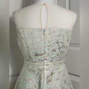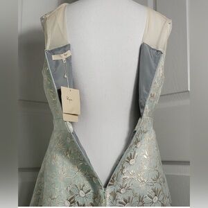 This elegant mint Ryu dress features a sleeveless brocade A-line design perfect for special occasions.