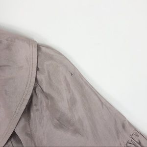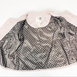 Ryu | ModCloth Jacket: short lightweight coat in a rayon/nylon:blend. Lightweight feel with polka dot interior lining. Small repairable hole found on upper left sleeve as shown in pictures. So cute!