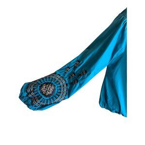• Long sleeves with dramatic embroidered circular motif on sleeve (see photos); elastic at wrist