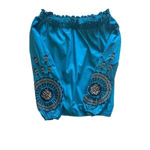 Boho chic, embroidered blouse, off shoulder top, teal blouse, boutique brand, RYU clothing, size M women, long sleeve top, elastic hem, statement sleeve.